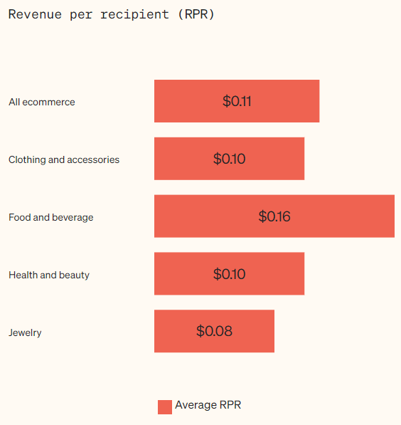 Another way to track your ROIs is by looking at your revenue per email recipient. See the averages for industry below, from Klaviyo.